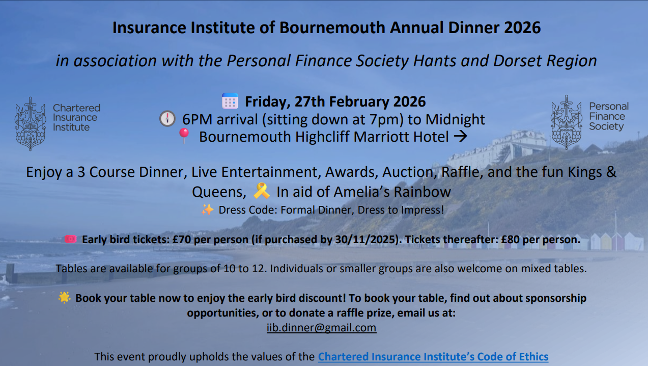 The President of the Insurance Institute of Bournemouth (IIB), Jana Langdown, cordially invites you to join her at the IIB Annual Dinner 2026, in association with the Personal Finance Society Hants and Dorset Region - a black-tie event celebrating our members and local businesses, celebrating achievements and charity fundraising. This is our biggest event of the year, and an opportunity to network with peers in the insurance and finance industries.