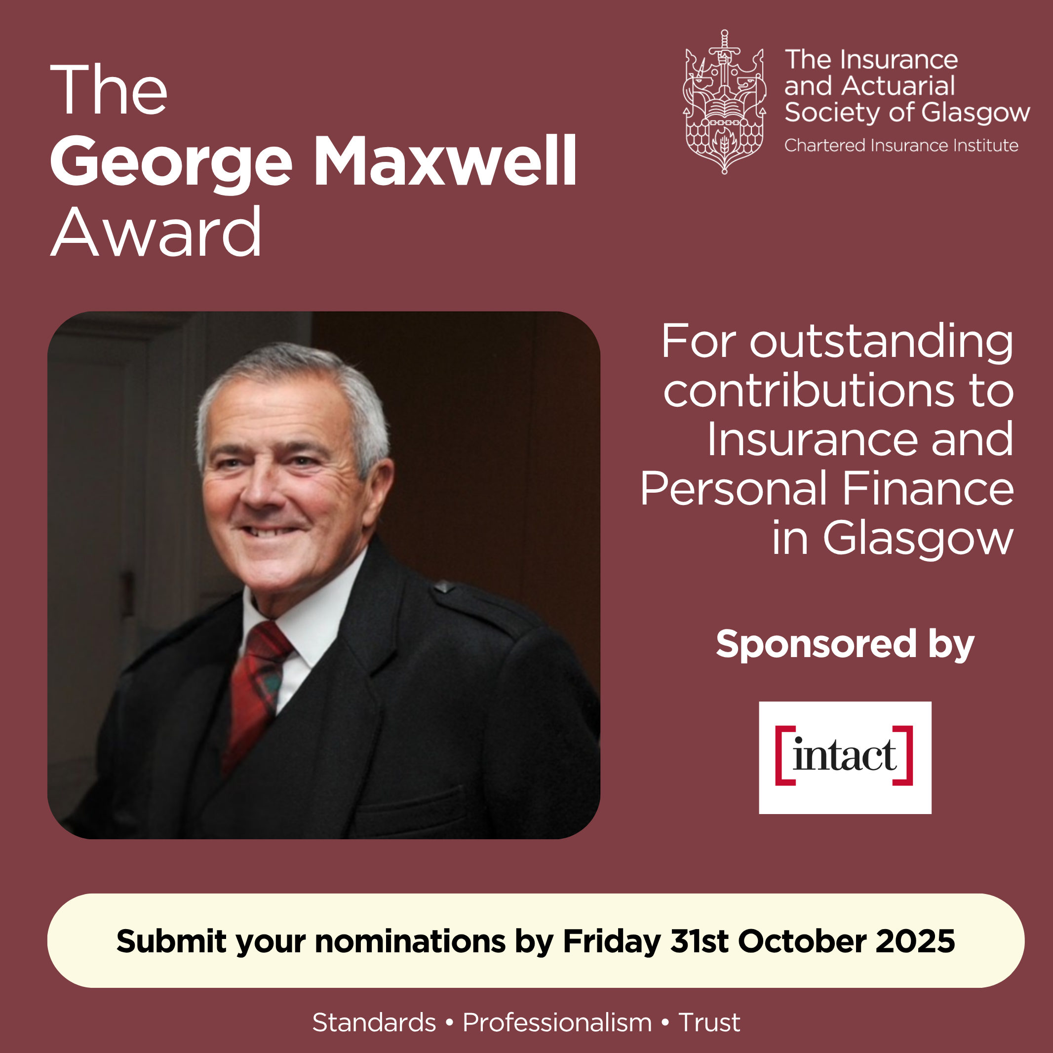 We are privileged to name this award after George Maxwell, who truly embodied the values it represents. George, a previous President of the IASG, was a highly respected figure within the insurance industry and sadly passed away earlier this year. He was instrumental in many local initiatives across Glasgow and the wider Scottish network, giving countless hours in voluntary roles within local Institutes. His passion and commitment over decades were an inspiration to many and were formally recognised in 2017 when he received the CII’s Outstanding Achievement Award. George leaves behind a remarkable legacy, and this award stands as a tribute to his lasting influence.