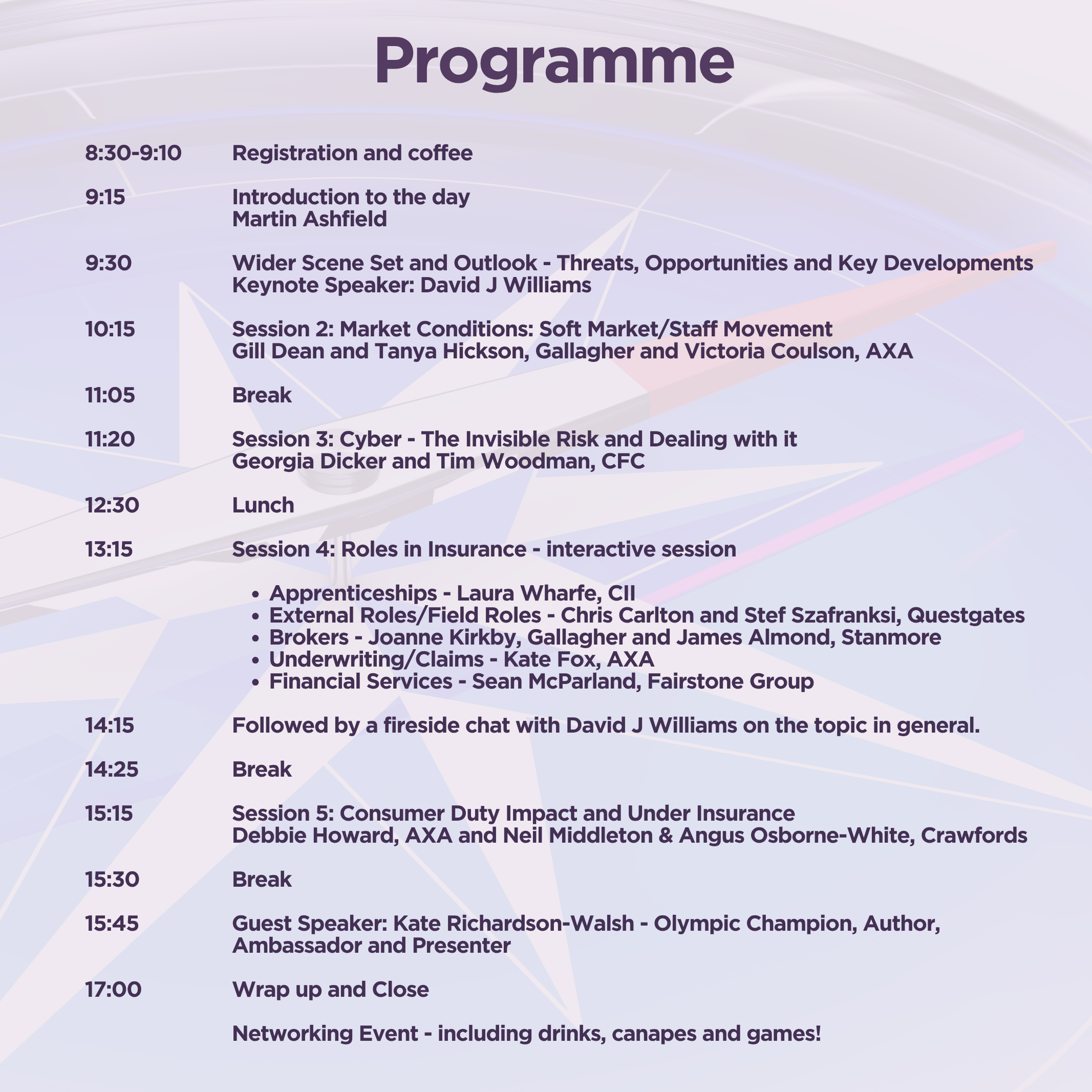The theme for the day is "Navigating Change in Insurance" where we will explore market challenges and issues. We will be announcing speakers soon, but we are delighted to announce the programme for the day as follows: