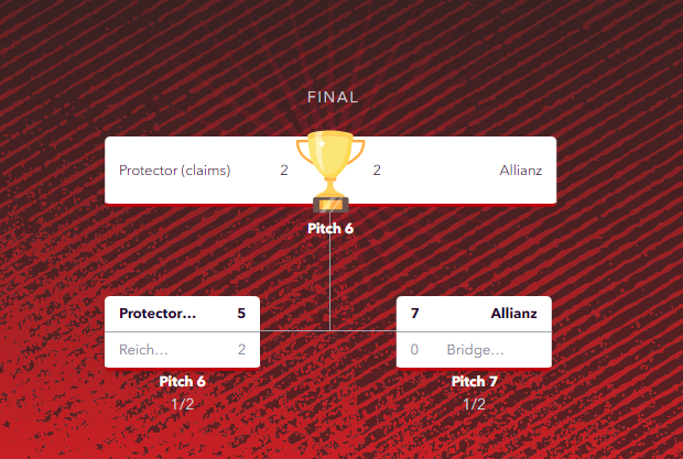The Semi finals went the way the results would suggest with the Group leaders pushing their way past the runners up to set up the tantalising prospect of an Allianz v Protector final. This was a tense match and the form books suggested an Allianz win. However, Protector fought hard and managed to carve a narrow 2-1 lead, Allianz could not get past the stubborn keeper and defence but just managed a late goal to equalise. The scene was set, penalties to settle it for the 2nd year in a row. Protector and Allianz both bagged their first with ease but then the nerves started to kick in with Allianz missing and really that was the end, Protector held their nerve and walked out deserved winners.