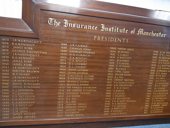 The Insurance Institute of Manchester President is elected by the membership at the Annual General Meeting and chairs the governing Council. There have been over 140 Presidents of the Insurance Institute of Manchester since it was formed. The first was J. B. Northcott in 1873 and, although times have changed, the ultimate objective of the institute and President remains the same to this day: to promote education and emphasise professionalism.